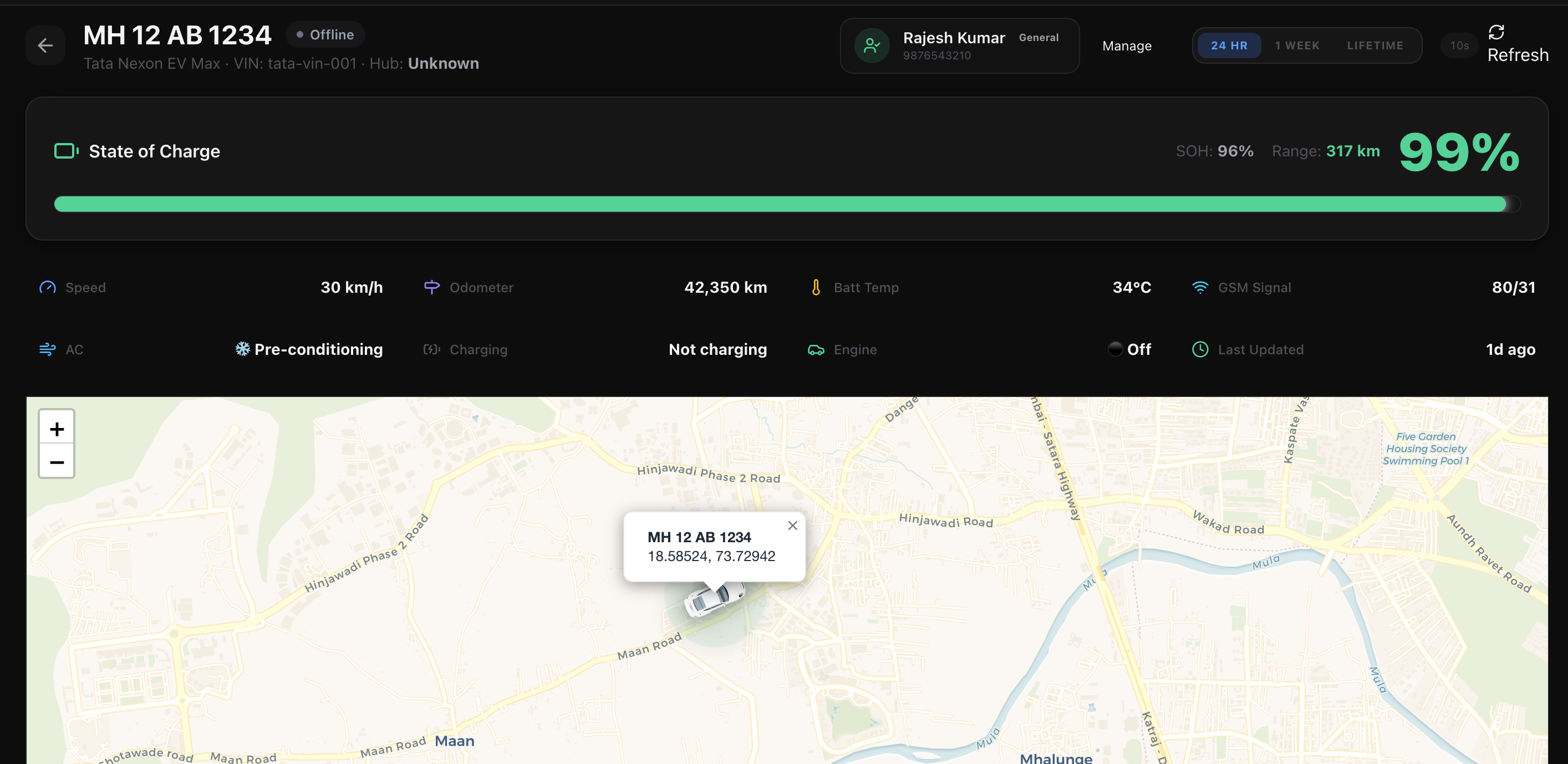 Observe thousands of vehicles simultaneously on a frictionless unified map. Track live speeds, battery percentages (SOC), actual range (DTE), API ping statuses, and active geofence routing in real-time.